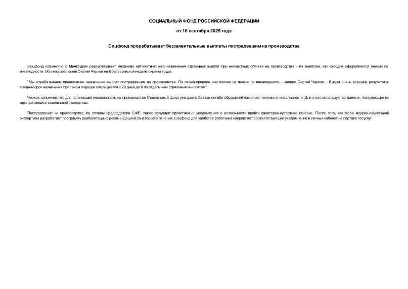 Статус: Информационный документ Текст документа: присутствует в коммерческой версии NormaCS Утвержден: СФР; Фонд пенсионного и социального страхования Российской Федерации, 16.09.2025 Обозначение: Информация Наименование: Соцфонд прорабатывает беззаявительные выплаты пострадавшим на производстве Дополнительные сведения: доступны через сетевой клиент NormaCS. После установки нажмите на иконку рядом с названием документа для его открытия в NormaCS